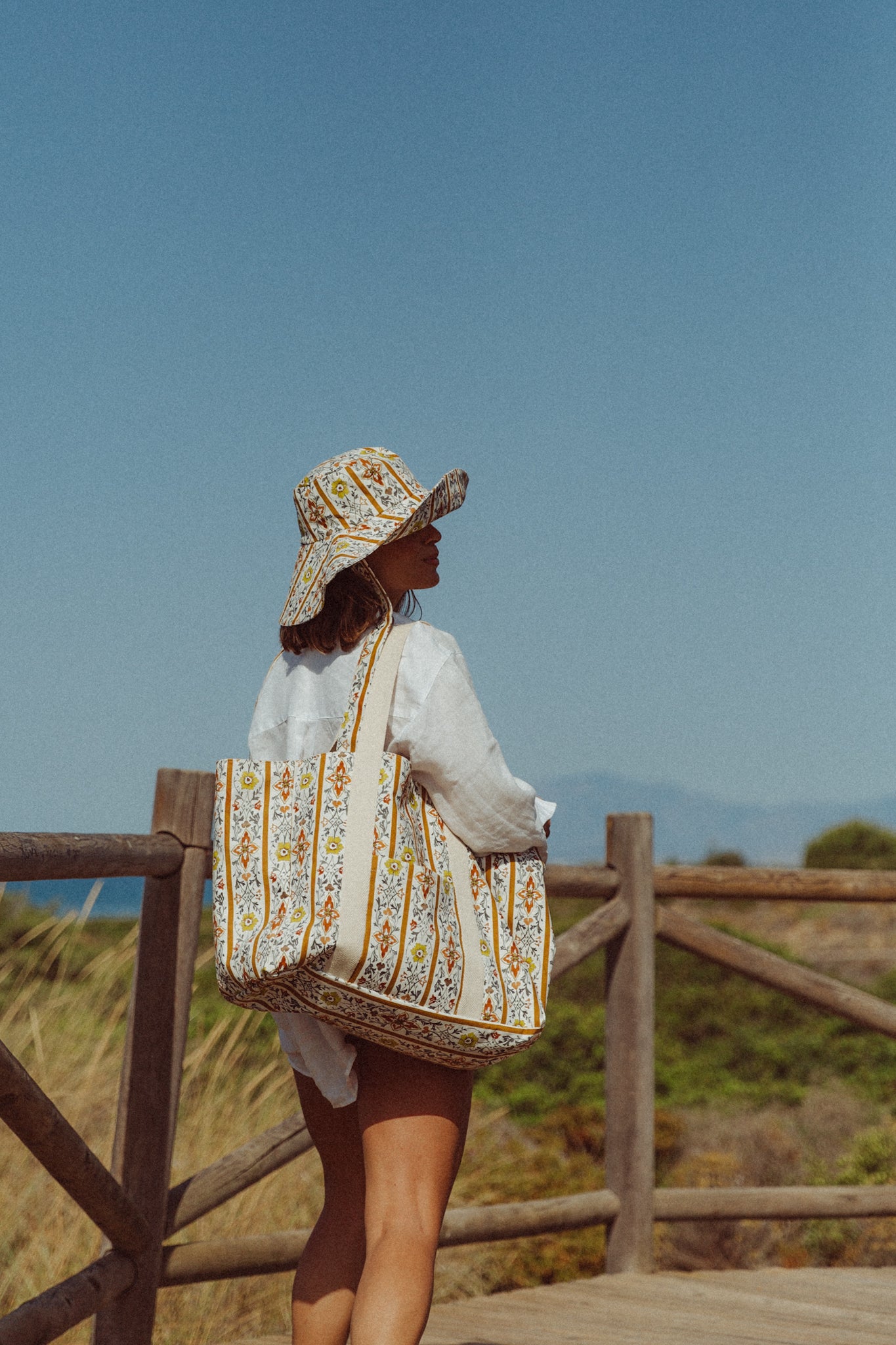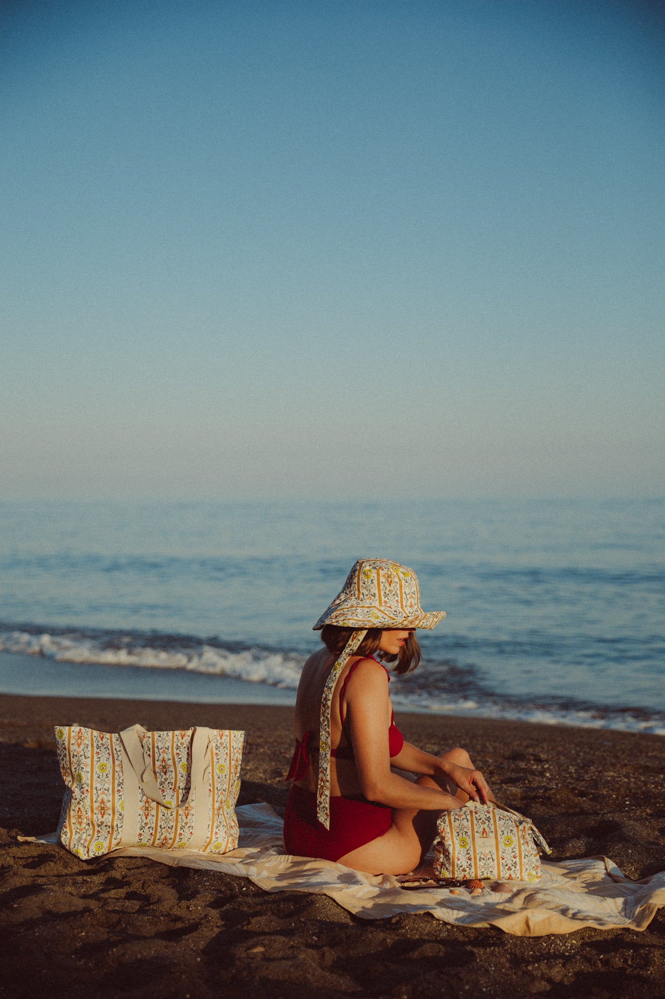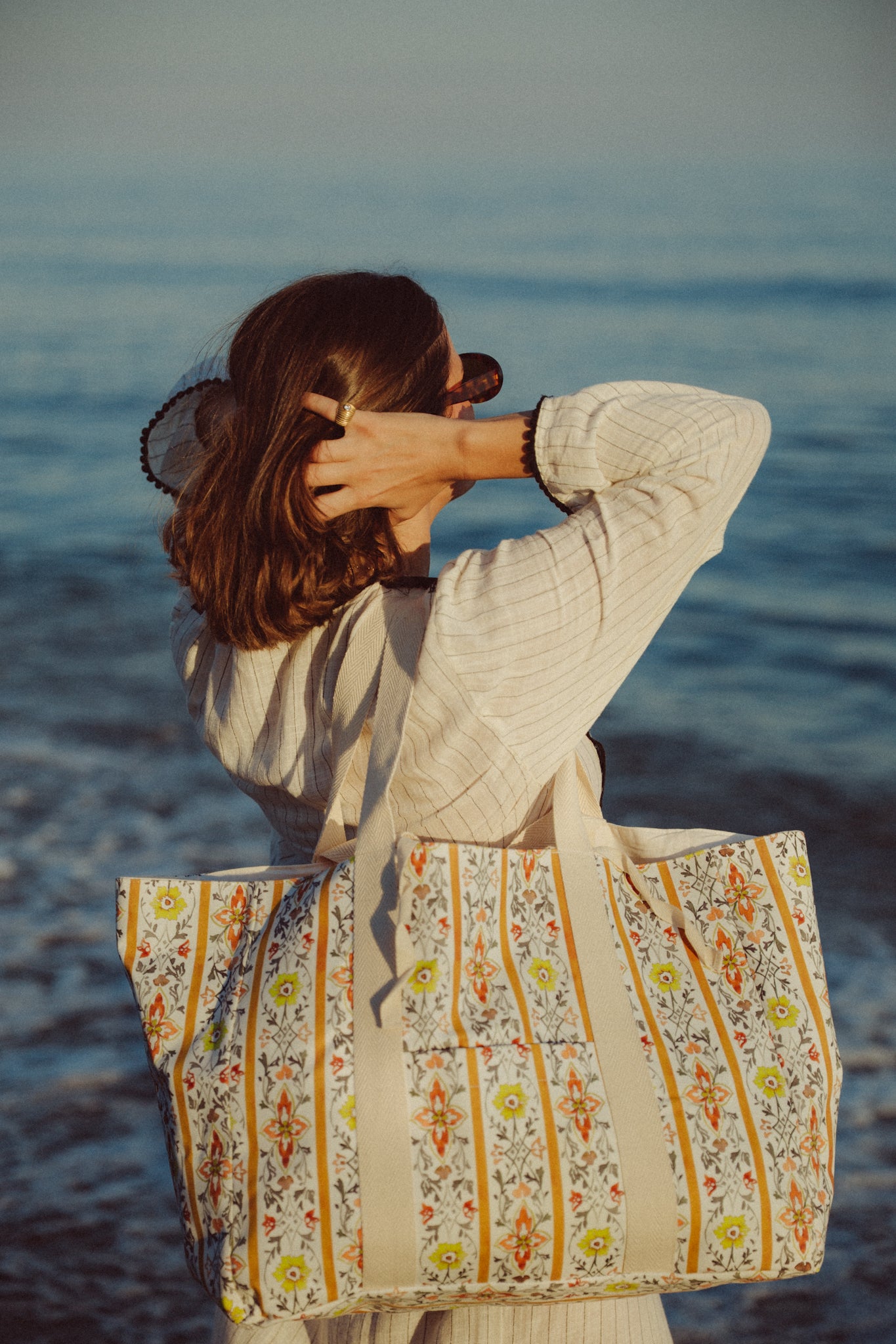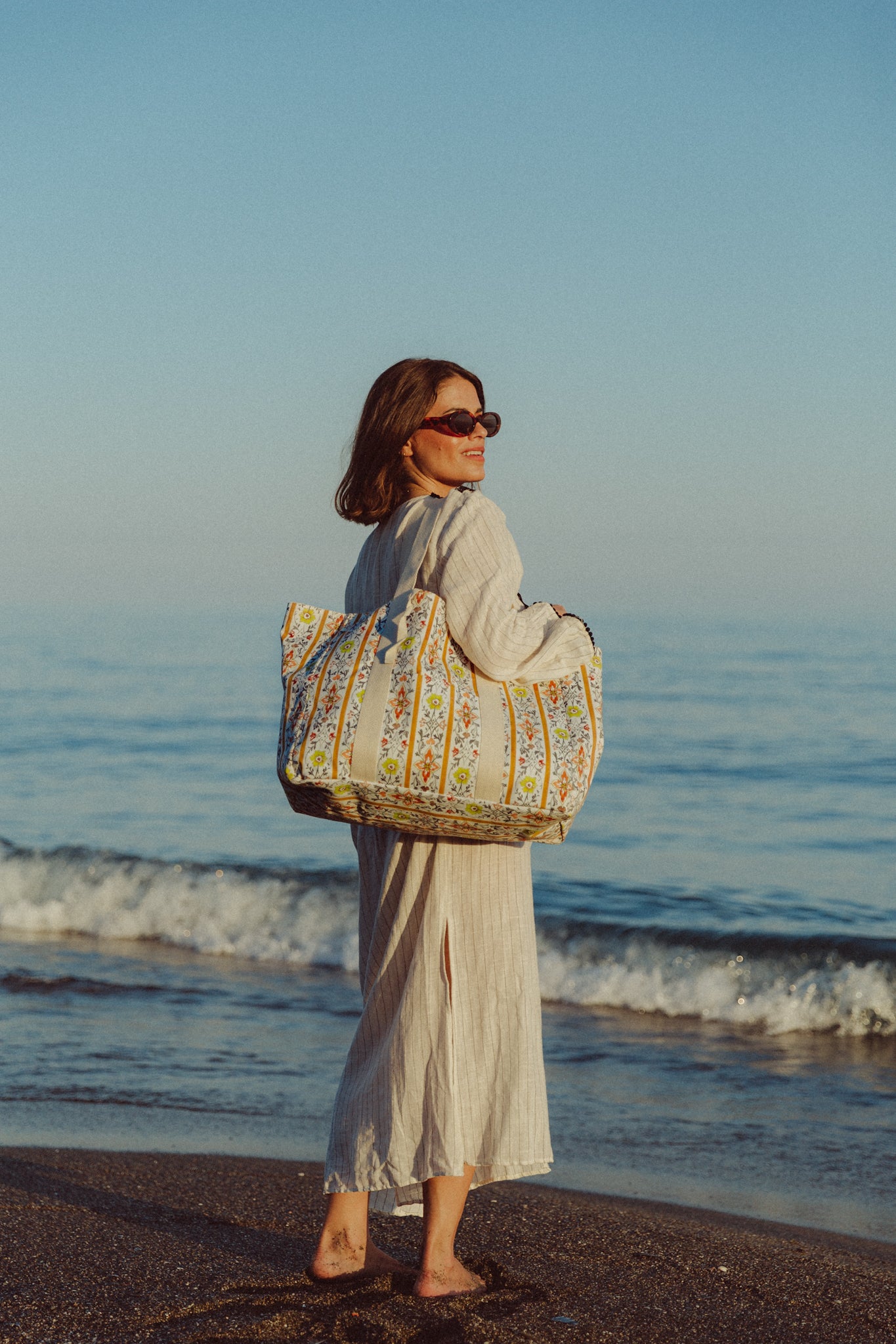 La bolsa mediana de playa de Tula Maison es perfecta para llevar todo lo que necesitas: varias toallas, un aperitivo, una botella de agua (o de lo que surja!) y el neceser Bruno a juego. Diseñada para aquellos que aprecian los momentos de tranquilidad junto al mar o en cualquier espacio exterior, esta bolsa es el complemento perfecto para tus días de verano. En cuanto a diseño, es igual que la bolsa grande de playa Santa Pola pero con unas medidas reducidas, la calidad y los acabados son los mismos.