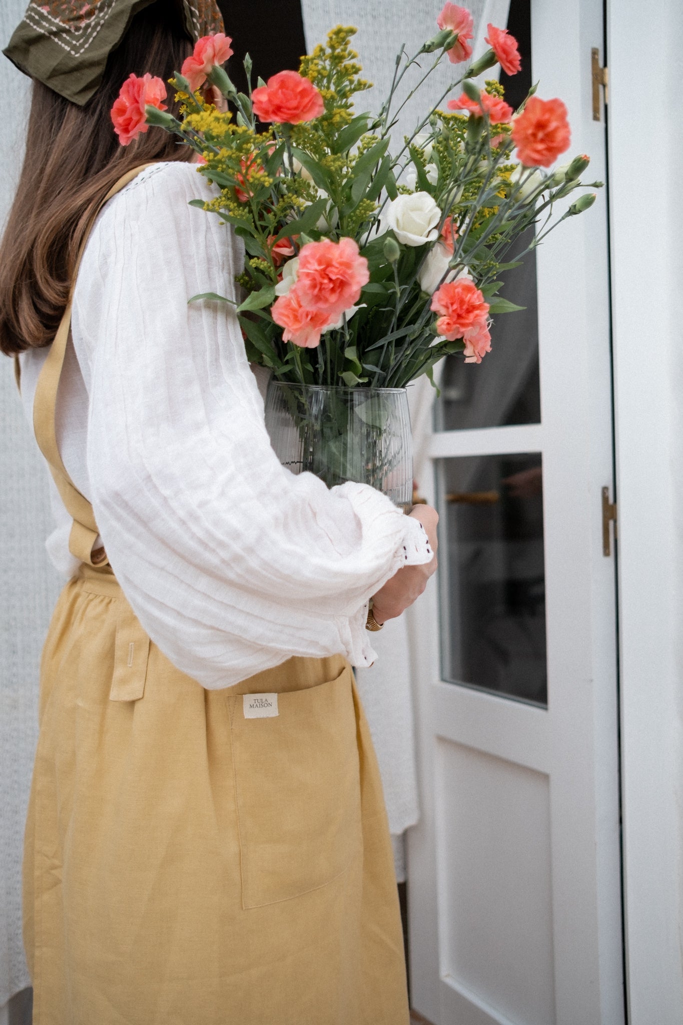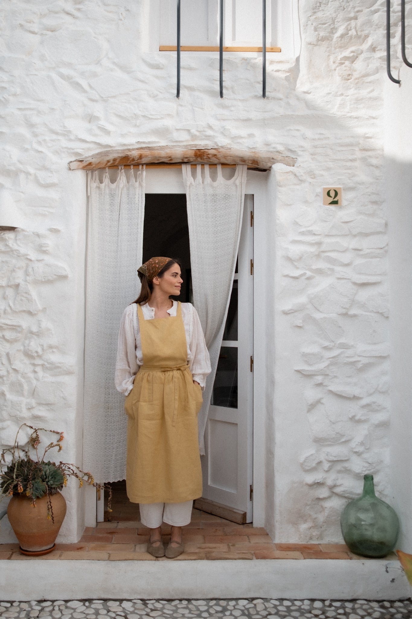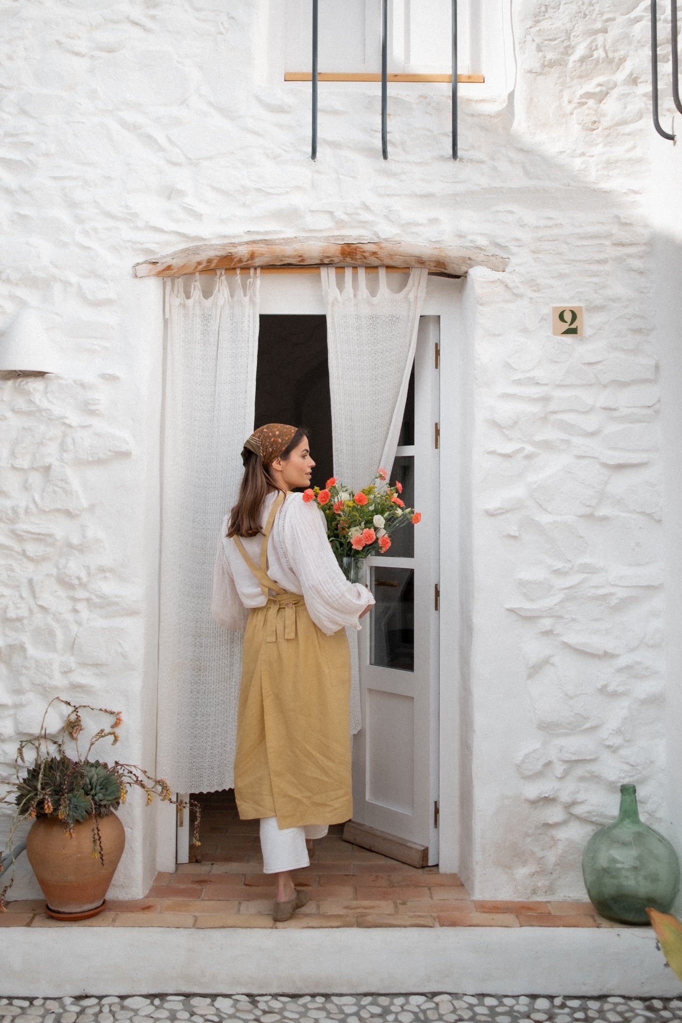 El delantal Emmy está diseñado para acompañarnos en la cocina, en casa o en el jardín con comodidad y estilo. Hecho en España y confeccionado en 100% lino europeo, un tejido muy resistente al uso y al paso del tiempo. Su caída natural y su textura suave le dan un aire rústico y atemporal, como esas prendas del hogar de antaño.